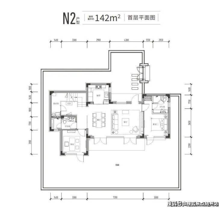 142㎡户型为例,面宽约15.2米,标准4房4卫。一楼是约7.2米长的双面采光大横厅,除了老人套房,还有个向院子伸出的“X空间”。它既能用作茶室、棋牌房,也能成为私密的客卧。