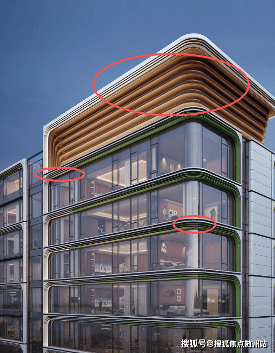 立面上,根据规划图展示预计,将运用浅色系铝板+陶棍+大面玻璃,加上转角圆弧设计,封闭阳台,提高得房率的同时,兼顾时尚大气。