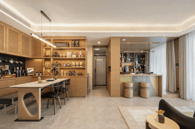 LDKB一体式打造,联动餐厨空间和休闲区,配上超大景观阳台,将室外景色引入户内,打破空间边界,引飞叶与花香穿堂留痕。阳台作为现代人向往自然的精神角落,以秘境庄园为主题进行空间设计,居家步履的尽头,邂逅勃勃生机。周末的午后,阳光打在摇椅上,品一盏清茗,暖意在花间鸟语中绽放。
