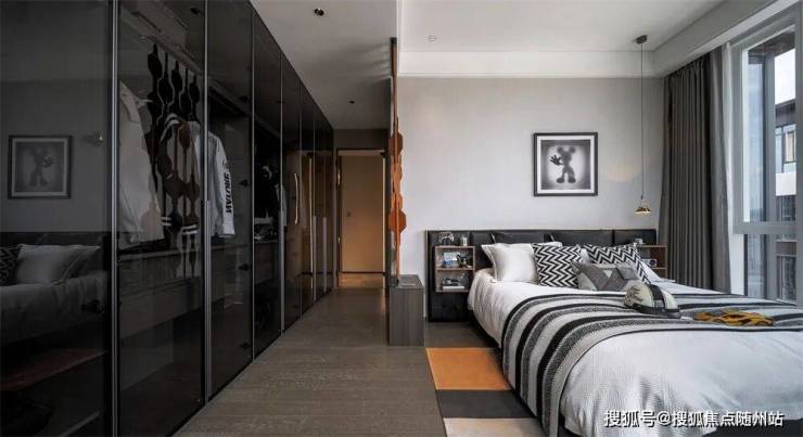 长辈房的布局并不落俗套,以床背板为弱隔断,划分出了睡眠空间和衣帽空间。面朝明亮的落地玻璃,天朗气清的格调让室内氛围更显松弛。床背板后的书桌兼顾妆台的功能,一人伏案,两人陪伴的共享空间,让卧室格局更显浓厚亲情。