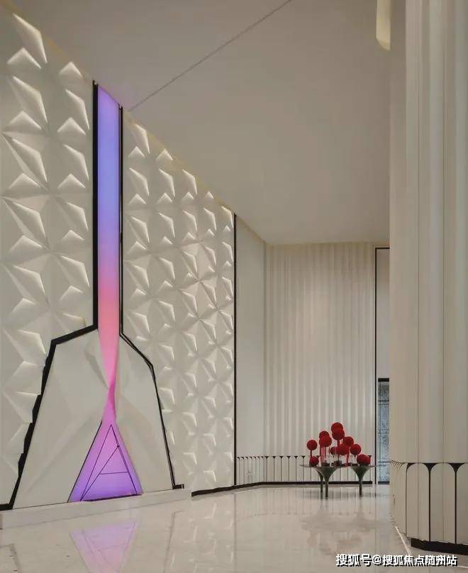 步入挑高约11米的一楼大堂,折线通高墙面与钻石切割前台 ,像极了兰博基尼发动机的散热鳍,又似来到澳门七星级酒店摩珀斯。