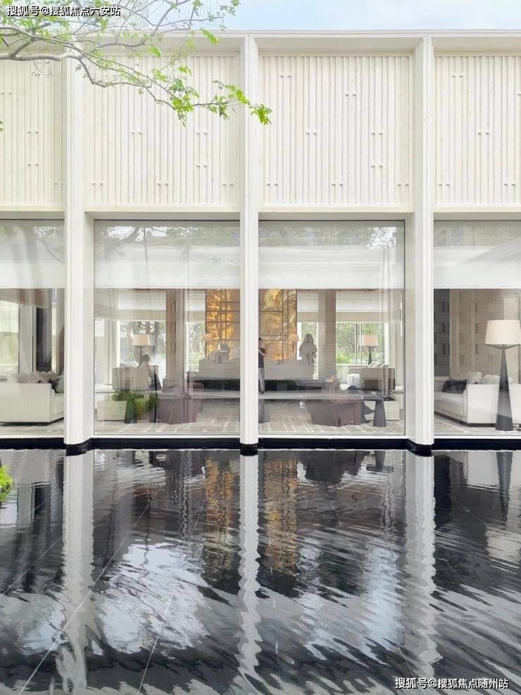 项目以希腊安缦卓熠为灵感,整个核心区园区以约900方的无界中央水景为主体。穿过大门后,约900㎡的无边界水景豁然眼前,建筑、回廊与树丛仿佛凌波而立。最为静美的所在是11号楼架空层的邻里中心——窗沿与水院无缝衔接,桌案与水面几乎齐平,风吹皱一池波纹,就从眼前荡漾开去。