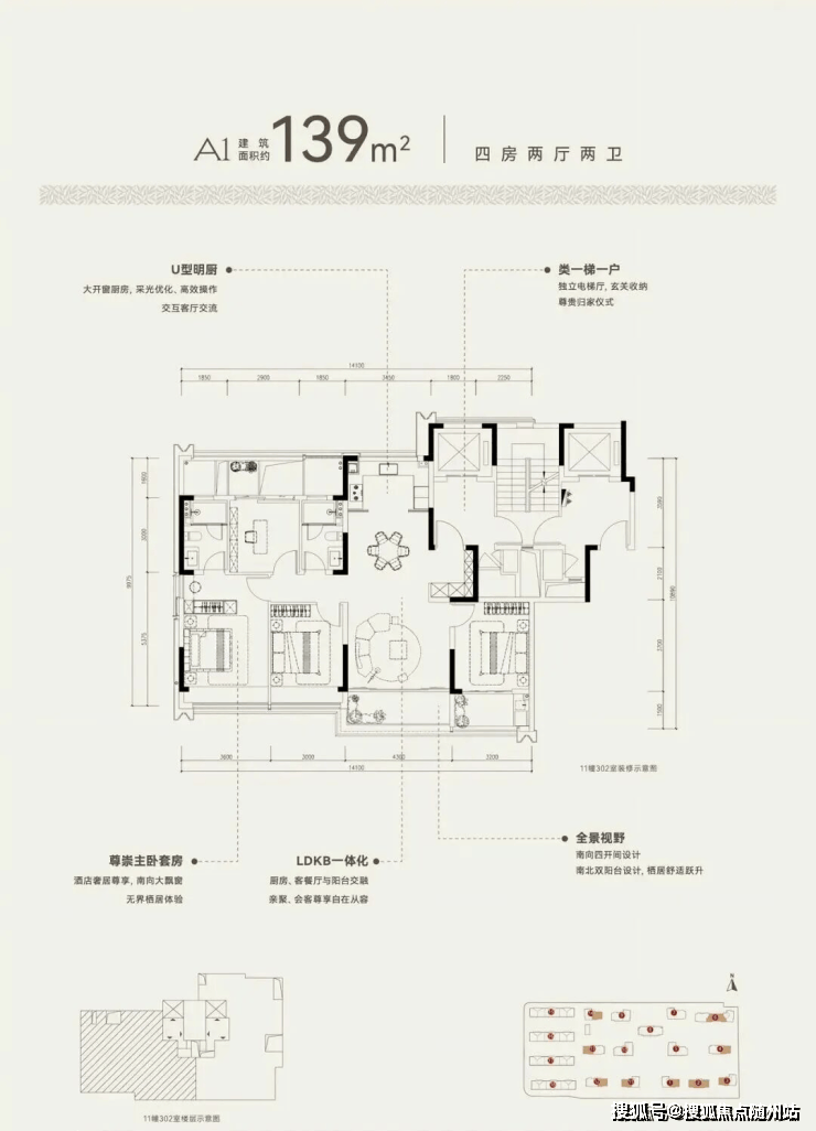建面约139方A1户型,四房两厅两卫