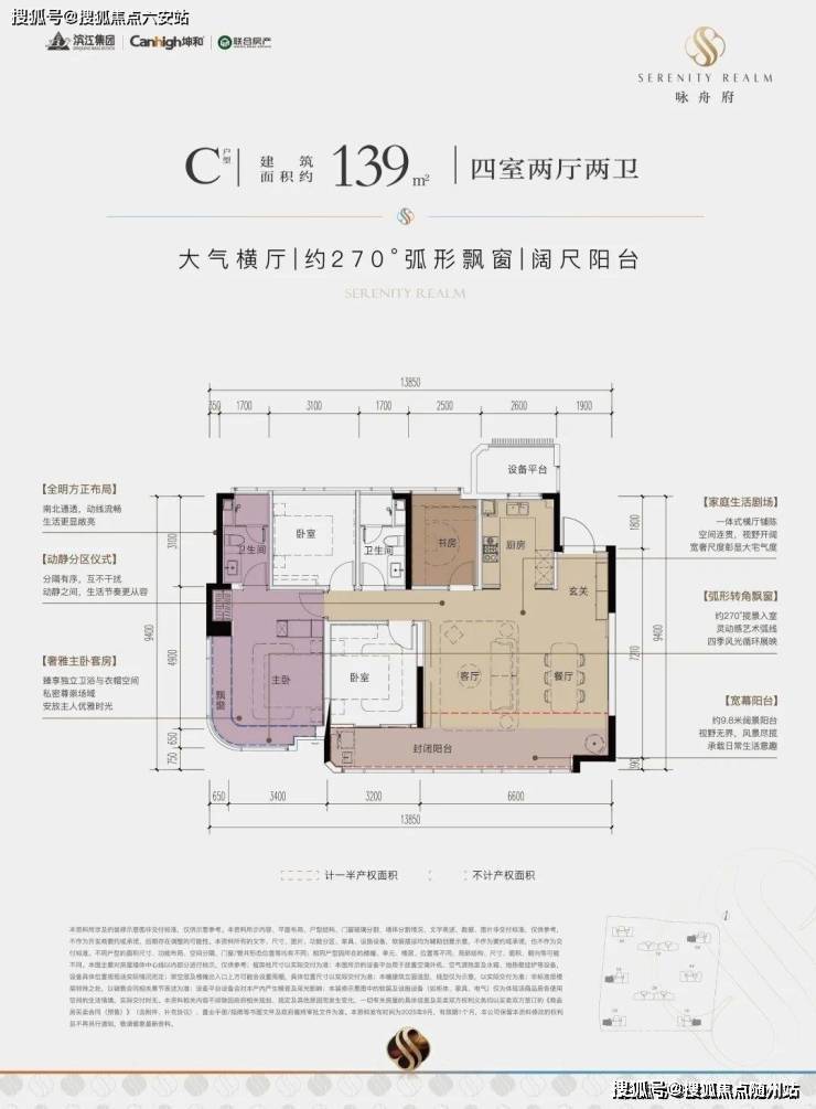 一款是四开间朝南的横厅户型,南向约13.85米的极致采光面,阳台也有约9.8米;动静分区,私密感超强;主卧套房带L型弧形转角飘窗,居住体感堪比全景舱。
