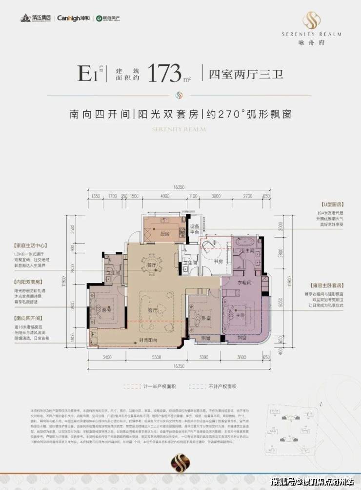 建面约173㎡E1边套户型,4房2厅3卫,类一梯一户,四房朝南,南北通透,主卧为大面积弧形转角窗设计,含赠送得房率约89%左右。