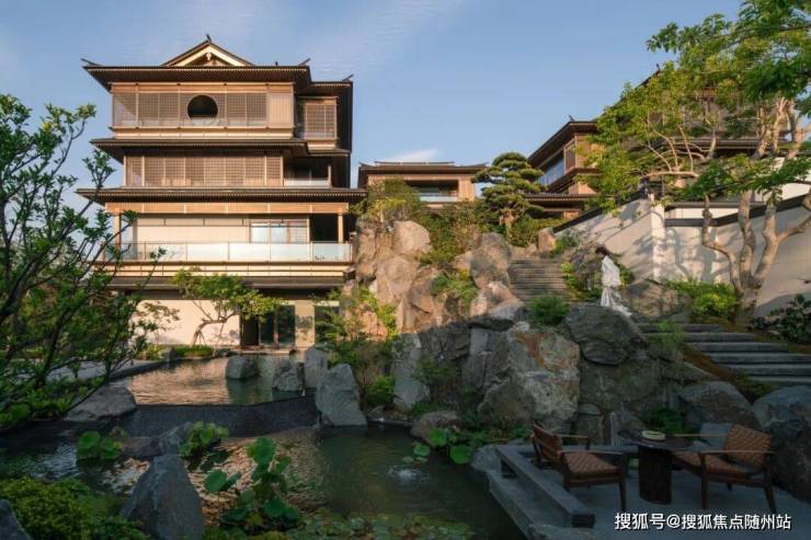 宋代郭熙在论山水画时就提到“但可行、可望,不如可居、可游之为得。”22#“泉香”总建筑面积6676.87㎡,其中庭院占地面积达2672.62㎡,俯瞰呈“L”形布局,全园结构精密得宜,自西南至东北依次设置理水、叠山,磅礴建筑绕院聚合,形成曲径通幽的行进序列。