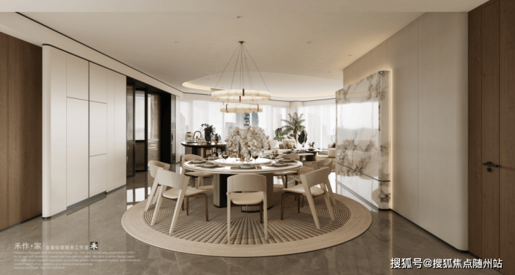 移步餐厅,Visionnaire Previous 餐桌以卡里冰玉大理石点亮空间。冰白色石材中若隐若现的浅灰纹路,如江南烟雨晕染的诗意,与翡丽风格芬迪白大理石墙面形成材质延伸。