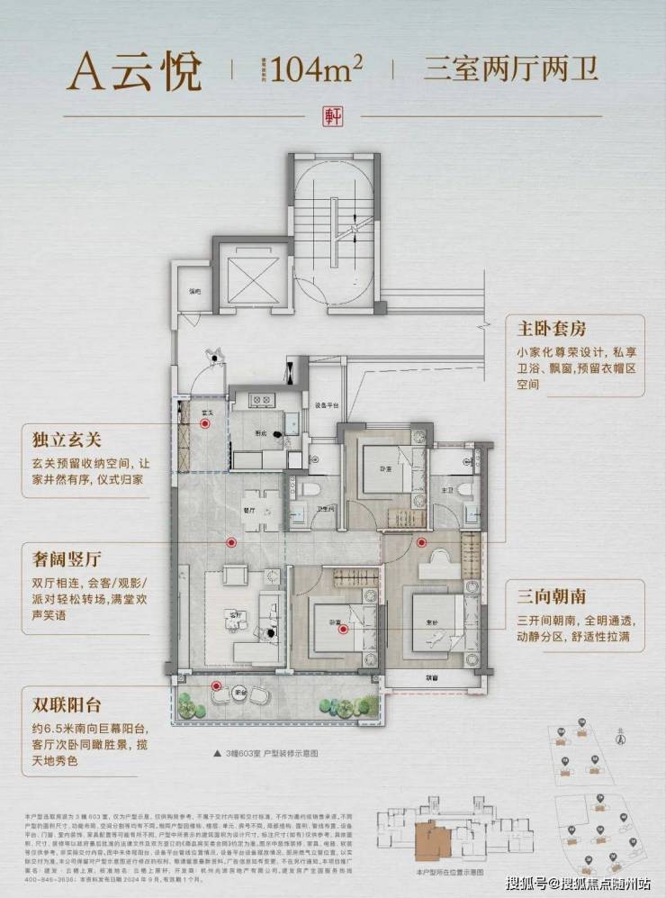 起步约104㎡,不仅做到了约6.5米双联阳台和主卧套房,还预留一整面墙的玄关收纳柜空间,主妇见了会欢呼。