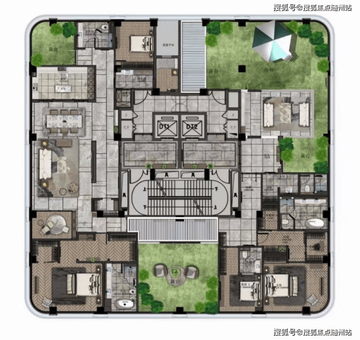 二楼带景观露台,顶楼空间则奢侈到夸张,490m²五房,一层一户送三个露台,比传统的300m²地上三层地下二层的别墅还舒服。因为别墅单层面积80m²,吃个饭楼上楼下跑,这里则是490m²摊在一个平面,因此这类顶楼大平层极度稀缺。