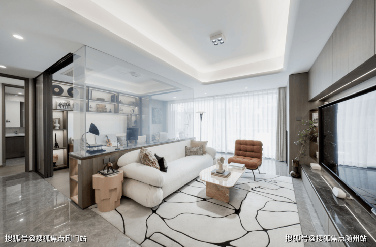 约 9.7 米宽幕三开间: 客厅 +南向双卧一字排布,清晨阳光漫进主卧飘窗,正午为客厅镀上暖光,傍晚次卧仍能捕捉落日余晖,让每个空间都有 “ 阳光游弋 ”的通透感。