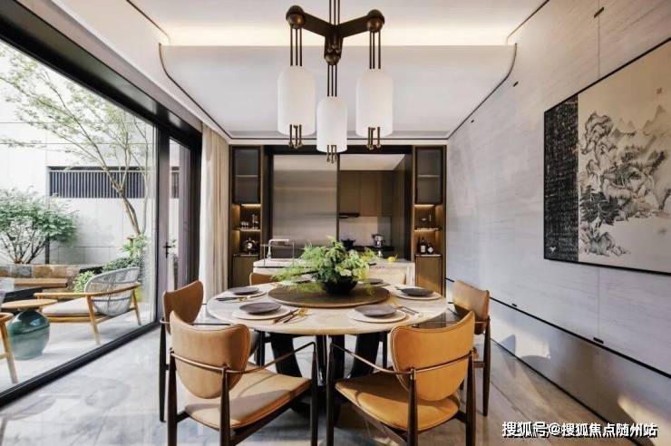 桃木色铝板复刻古木纹理,搭配大面积落地窗,既还原中式窗棂的通透,宽幅的开窗面又让山景、院景一无窒碍地涌入室内。