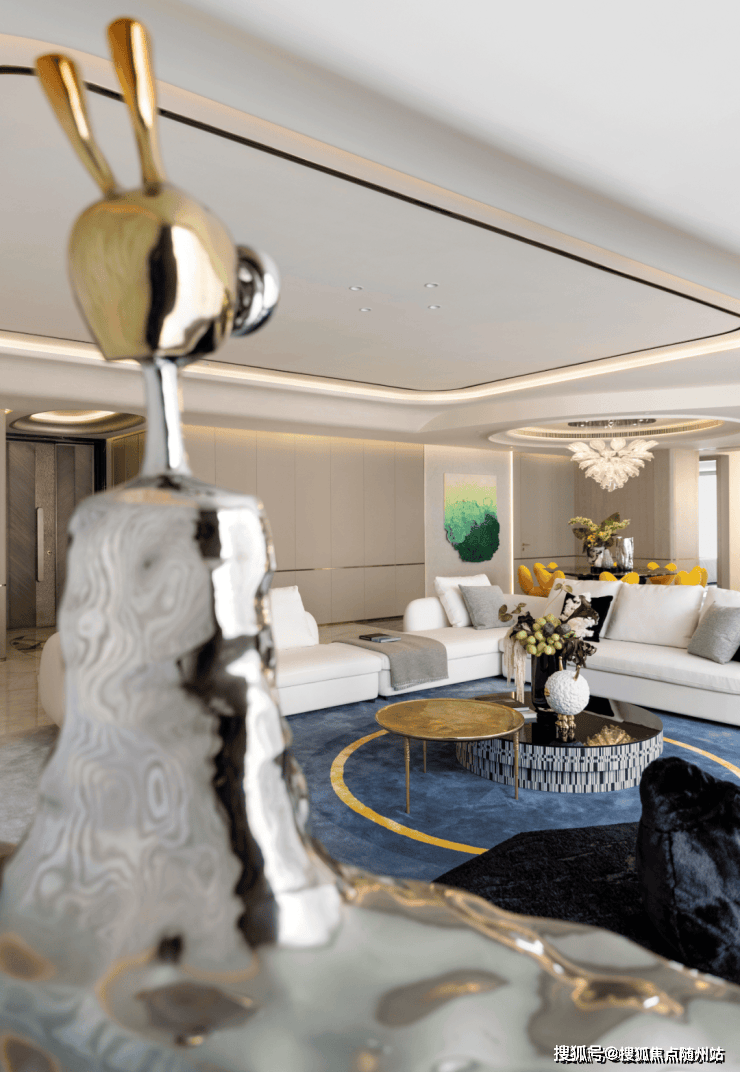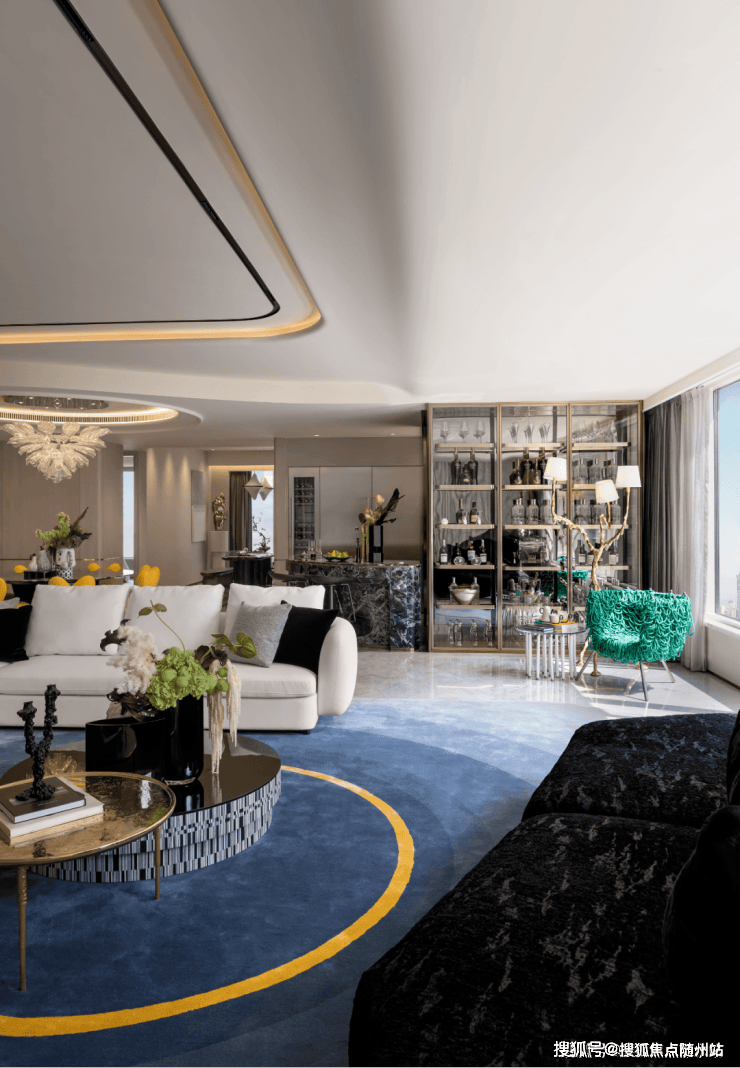 约300㎡“观湖”,谢柯打造;另一款是更宽舒的约412㎡“行云”,出自邱德光。尤其是约412㎡“行云”,无论玄关处雪花白、劳伦黑金、金世纪的大胆拼花,瓦楞式的波浪形电视背景墙,还是吸睛的普拉达绿石材吧台,全屋随处可见出色审美和奢华材质的完美结合。