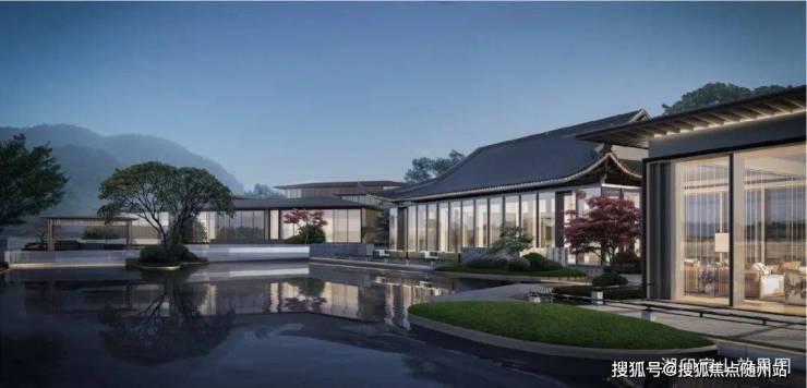 项目依山势分为六大组团:绿屿、香洲、明月、清风、凌云以及安和,整个项目均为中式低密住宅,绿屿组团以苏式园林为造园蓝本,而其余组团则均为宋代中式风格。宋代中式合院,南向采用落地玻璃幕墙,视野采光通风效果绝佳,坡屋顶设计,线条简洁大气,整体造型流畅。