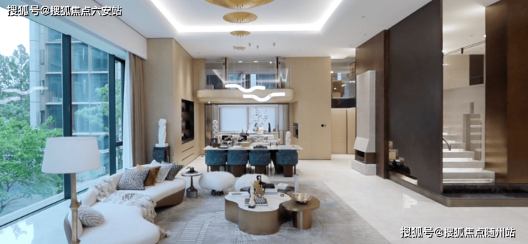 洄游入户动线,艺术楼梯,约全落地巨幕玻璃窗,尽揽首层花园、园林谧境。270°全面屏环幕采光,4.8米挑高近80㎡会客领域,每个角落都沐浴在自然光中,尽情享受无界社交的写意松弛。