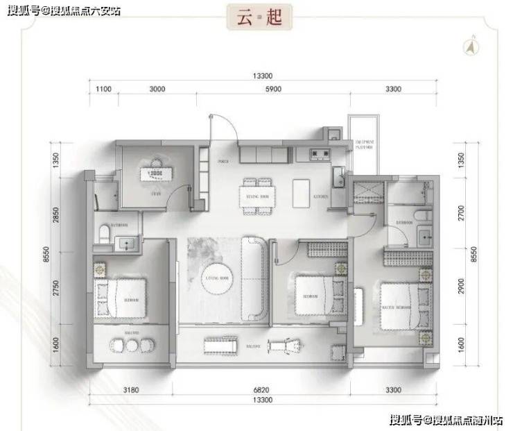 西源赋的主力户型为125㎡、139㎡、168㎡的高层四房和230-310㎡的叠墅产品。125㎡户型为四室两厅两卫全明户型,采用四开间朝南设计,南向面宽约13.3米,配备约6.8米双开间观景阳台。