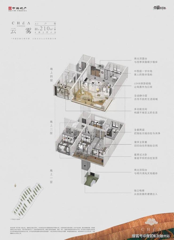 例如起步建面约210方上叠户型-云雾,上下都配备专属电梯私家入户,上叠行政级主卧+两间大尺度次卧,均是套房设计,做到了真正的全屋套房平权,主卧更是在南北做到了双面花园景观入室。