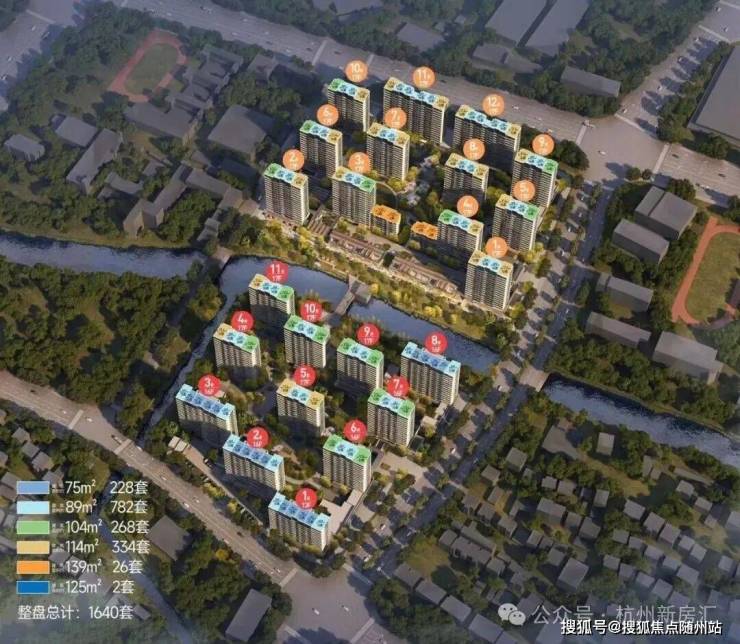 总计规划住宅1640户,以萧绍运河支流分为南北两地块,北地块由12幢小高层及2个单元洋房组成,南地块布局11幢小高层,户型面积覆盖76-139平方米。项目作为杭州首个引运河入园的滨水社区
