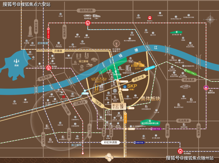 生态资源:项目西侧直线距离约500米即是萧山城市公园(城市绿肺),东侧紧邻钱塘江(萧山段)景观带,推窗可见公园绿意、出门即入江风氧吧,“都市繁华”与“自然诗意”在此完美交融。