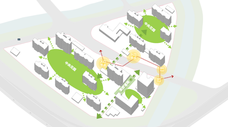住宅围合中央大花园布置,形成放射性的景观中心,沿南北地块中间的规划道路布置多个城市节点,连接东西两侧的河流景观,40a与40b地块之间打造自然的景观视线通廊,结合南侧建筑形成丰富的天际线,沿南侧高架城市道路展示良好的城市界面。