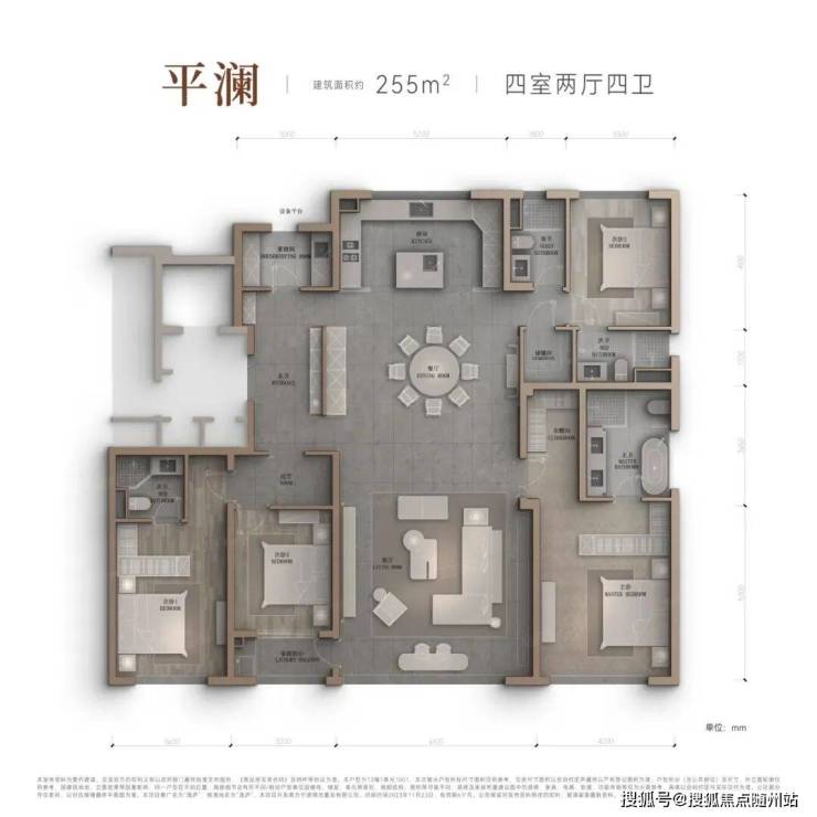 255㎡:四开间朝南,玄关以“折线”分割动线与静线,符合当代豪宅的审美趋势;