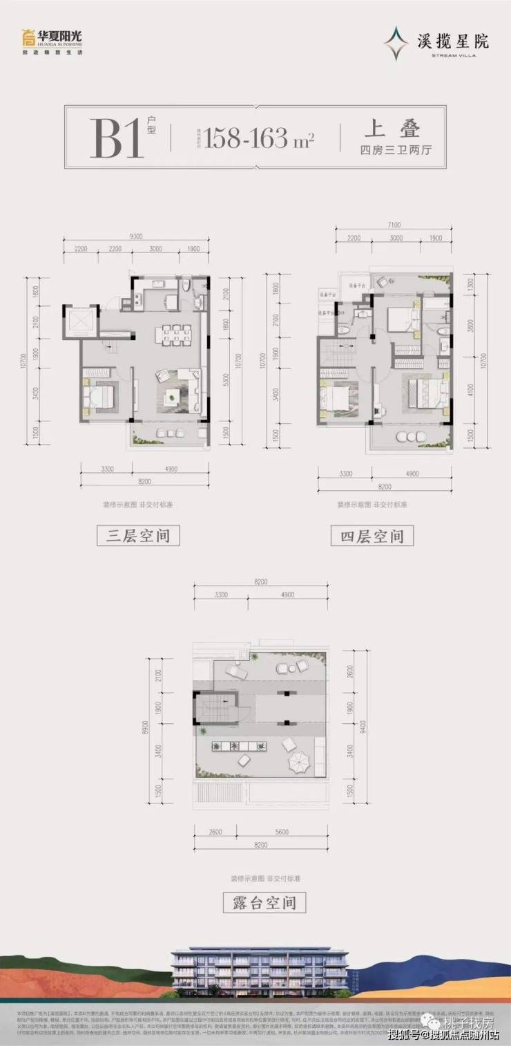 建面约158~163㎡上叠:顶层景观阳台/餐客一体连厅/套房式主卧/舒奢三卫设计