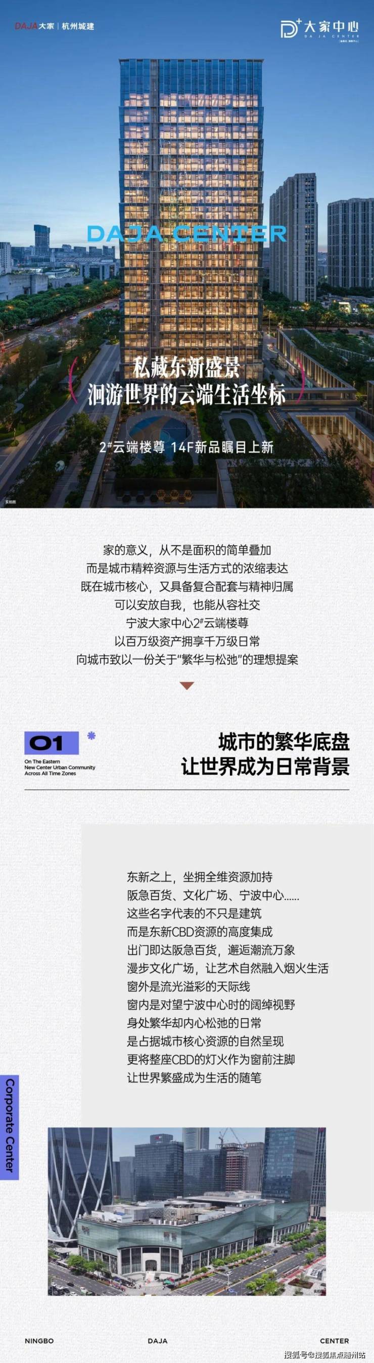 从双芯交汇的黄金区位到国企精工的品质保障,从双地铁口的交通优势到全能配套的生活便利,东部新城大家中心以4.79 米层高精装复式空间,为宁波都市精英打造了一个 “市中芯,小面积,大世界” 的理想家园。无论是首次置业的年轻人、追求品质的改善族,还是看中投资回报的购房者,东部新城大家中心都能满足多元需求。