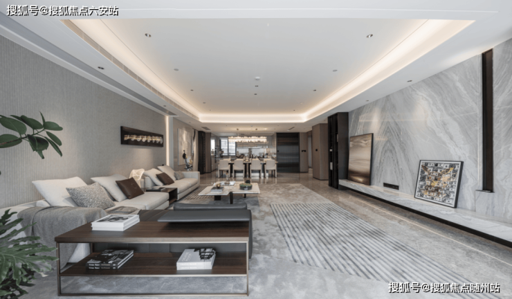 面积约315m²的四房,设计一梯一户,推开约1.5m的子母装甲门,是巨大的约6.3m×12m的餐客厅,欧努灰地面映着冰川白奢石,温润雅致,八人位餐桌岛台配着晶莹的酒柜,欢乐闲适,电动窗开启的阳光绿植,是轻松假日。