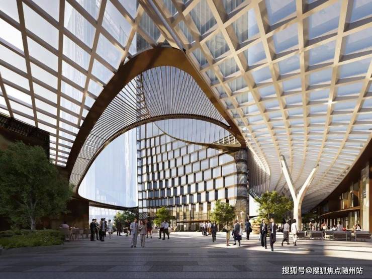 天幕雨棚,通过柔和的曲线将建筑立面以流畅的姿态向下延伸至裙楼部分,将各个塔楼和不同功能空间连接起来,形成一个壮观的曲面顶棚"天幕",保证了空间中的每个模块都相互关联,但又保持独立性,创造出半户外的休闲空间。