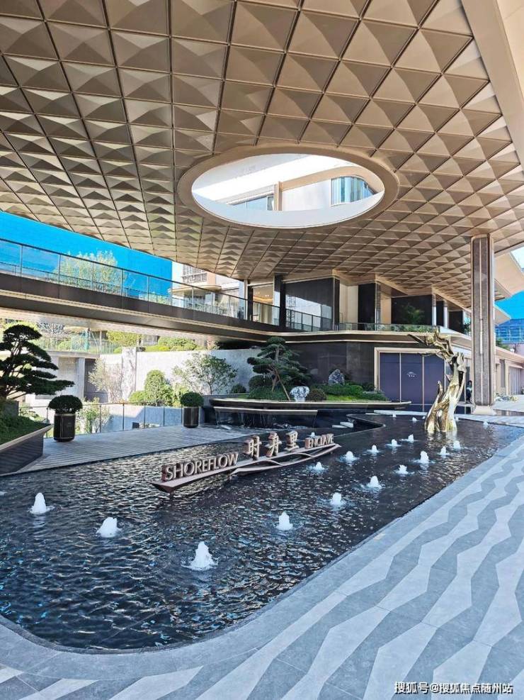 其中下沉水院作为关键归家场景之一,以水为引,叠瀑飞流,对景廊架,还有风景连廊,搭配波光粼粼的镜面水景和绿植点缀。