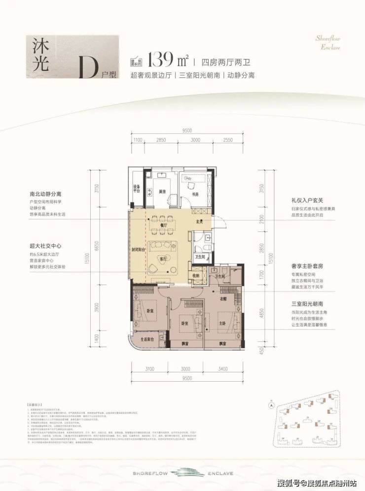 这款户型堪称四开间朝南的“流量王者”,南向面宽约13米,双联阳台+双飘窗设计,视野和采光优秀;套房主卧、双阳光次卧,颇有大平层的气势。