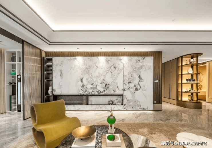 目之所及,遍布芬迪白、喜马拉雅灰、雪山蓝等名贵奢石,将“浮华”二字堆砌得恰到好处;除此之外,大量深色木饰面的运用,则让整体风格显得低调而沉稳。吊顶、墙面,随处可见的弧形元素,炫技的同时又增添了温馨调性,奢华中带着松弛感。