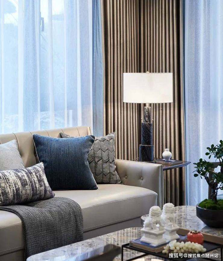 走入空间,可见水纹的柔美点染于软包、画饰、地毯等软装上,渲染出怡人舒适的空间氛围。三扇大面积玻璃门窗,将四时风光纳入框景中,邀人坐看自然的生机、时间的足痕。