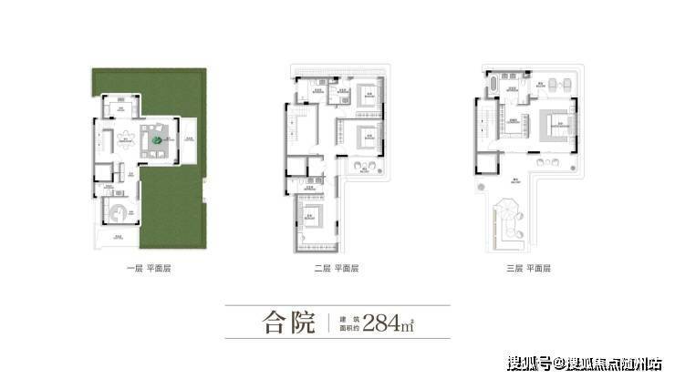 • 合院:建面约284㎡,三面围合庭院+独立家政层,定义“有天有地”墅居标准。