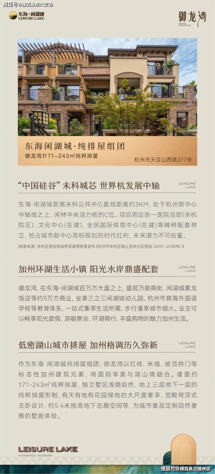 杭州第三中心内具有加州格调、既有高层又有排屋、生活教育设施配套齐全、环境优美沿湖而居的美丽生活小镇「东海·闲湖城」大城已成!纯排屋组团——御龙湾正式交付