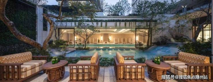 这次在蕙澜月华,绿城创造性地做出了一个「恒温泳池综合体」,把下沉式庭院里的露天戏水池,直接放在了地下恒温泳池的外面,它们之间只隔了一整排折叠窗,戏水池边上还做出了一片廊下休闲空间。