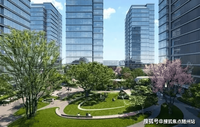 整个园区以围合式布局展开,七幢建筑借鉴中国古典园林的精髓,最大楼间距达到了63米,使得每栋楼都能享受到270°的开阔视野,仿佛是一座座隐匿于花园中的岛屿。为了与景观相呼应,园区立面采用“水晶天幕”设计,线条纤细,使建筑宛如天空中垂下的纯净湖面。