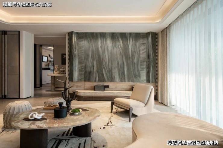 闷热梅雨季,最难忘的莫过于约210㎡户型,客厅背景是整块“一碧千里”石材,犹如展开了一幅碧涧流泉的青绿山水,通体清凉。