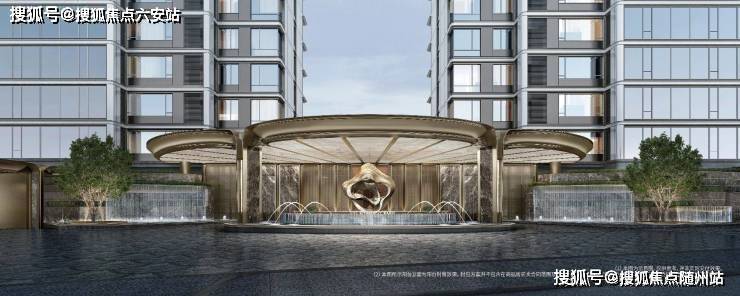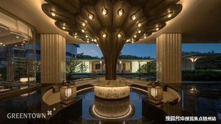 在门廊之前,绿城更是不计成本地落下四组叠瀑水景,涟漪生花;中央水景以潘多拉奢石为底;落客区的地面也采用了扇形石材铺装……