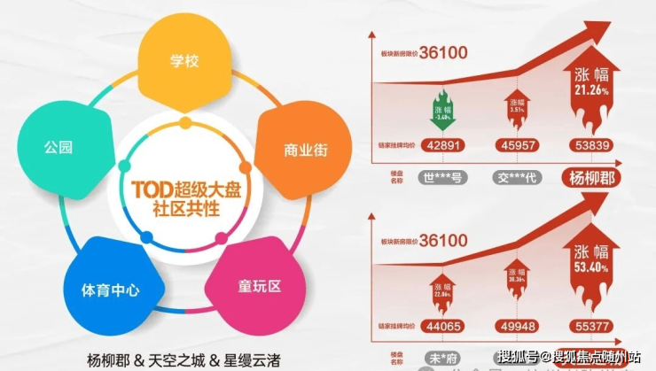 且从市场表现看,以杨柳郡目前挂牌价53839元/㎡,所在板块新房限价44400元/㎡;天空之城挂牌价55377元/㎡,所在板块新房限价36100元/㎡(数据来源:链家7.1挂牌均价),自带配套大社区溢价相较普通社区更具长线优势。