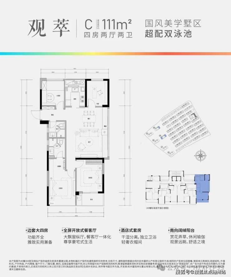 山水·颐萃别院容积率1.5,分为高层和排屋两个区,高层区总共6幢住宅,只规划了三款户型:建面约95方、约97方和约111方。