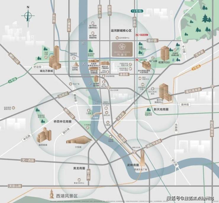 距离京杭大运河仅800米,饭后散步可达。文化地标大运河博物馆距离项目仅约1.3公里,邵逸夫医院大运河院区更近,只有约1.2公里,鸣澜里到15号线地铁康桥站(在建)仅约300米,地铁4号线平安桥站TOD约800米。以上这些都是家门口步行可达的配套。