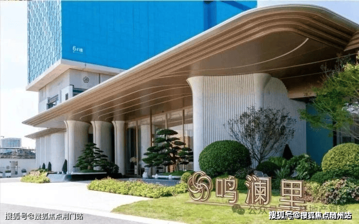 门前两棵罗汉松;园区内的中央园林围绕新型蓝宝石戏水池打造,营造澜韵迎宾、松鸣涧语、鸣泉叠韵、鸣芳拾趣、鸣香径幽等九境空间。
