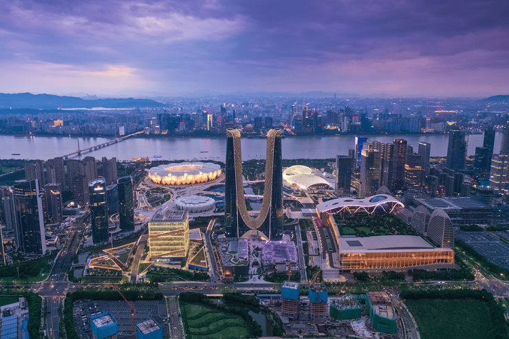 杭州之门,又名杭州世纪中心,是由美国SOM建筑事务所倾力打造的浙江省重点工程。项目位于杭州新城核心板块——钱江世纪城奥体板块核心位置,东至杭州国际博览中心、南至奔竞大道、西至综合训练馆、北至七甲河,总用地面积约77572平方米,总建筑面积约53.25万平方米,总投资近100亿元。建筑高度约310米,双塔全玻璃幕墙曲线立面,由地面逐层收缩、变化直至塔冠,玲珑剔透、流畅纤细,直插云端。