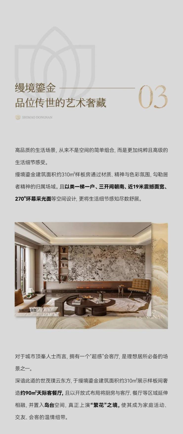 意境东方340,一层一境360°全屏环幕视野,两梯一户一层尊崇礼遇,南向最大约18米IMAX级采光面,面面观景。缦境鎏金310 ,极致享受约90平BLDK天际会客厅、总统式洄游主卧套房、奢配星级酒店全系卫浴系统...