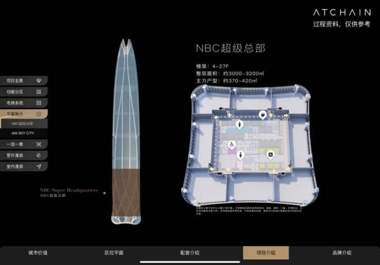 NBC占地7872方,总建约24万方。高度409米,分为地上80层,地下3层。