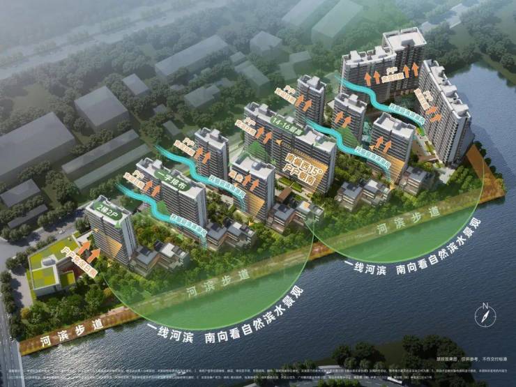 产品主要以小高层和叠墅为主,其中16栋为14-16层的小高层住宅,5栋临河的4层叠墅。由于临近军区的原因,所以朝向不是正南,而是偏西南,小区设计南低北高,东侧的临河位置由于限高15米,做了5栋4层高叠墅,西侧也是小高层15-16层设计。