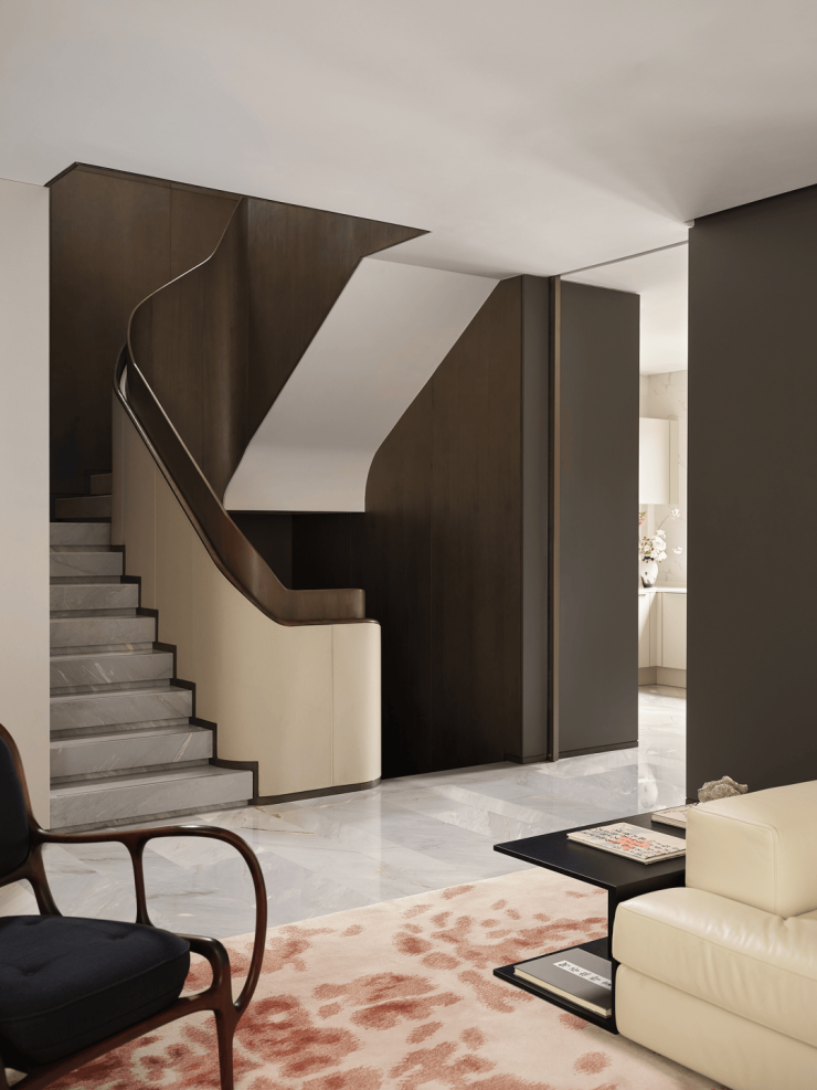进入明亮的客厅,柔软、舒适的Cassina靠垫沙发与Ceccotti由22根木头手工打磨隼接的扶手椅,象征着古典与当代的自我对话,与木质、大理石穿插的边柜、茶几一起展现出现代生活中社交、娱乐和会客的复合性。