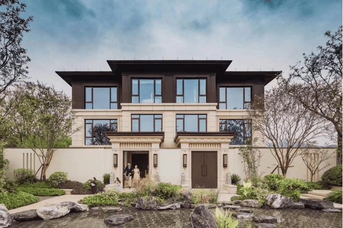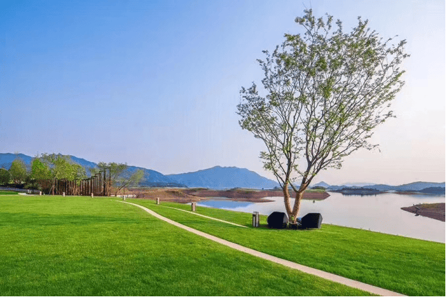 【设计理念】整体建筑呈现新中式风格,提取千岛湖自然山水元素与现代社会的居住环境相交融。她在半岛福址之上,得山环水抱,藏风聚气之利,揽青龙来水、白虎出水之势,继承人丁兴旺的家族理想。