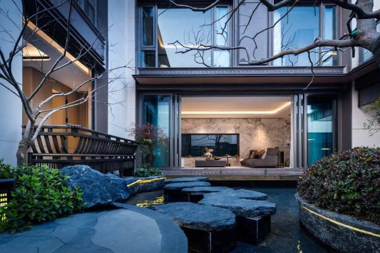 庭院由香山帮匠人合力打造,工艺与古法一一对应,传承2500多年非遗营造技艺,将中国人骨子里的院落情怀落地。推开宅院大门,“室内桥”设计,涓涓流水入宅,营造别致流水景观。假山叠瀑、自然水系、东方韵味的美人靠等景观合围,院中大树乌桕,庭院深深,目之所及是浓缩数千年的时空画面。