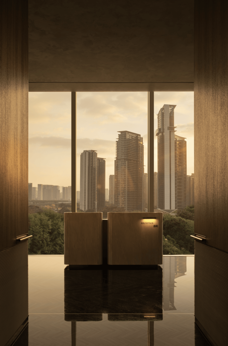 整个建筑群的布局沿着奔竞大道展开,由四栋塔楼和附属的酒店配套裙房共同组成。这个 26 万平方米的综合体项目,由七位行业大师联袂打造,其设计的核心理念是将国际化大师的智慧结晶、艺术性生活表达和杭州本土文化的融合,创新出一个独一无二的“城市会客厅”。